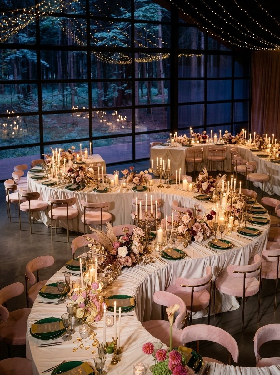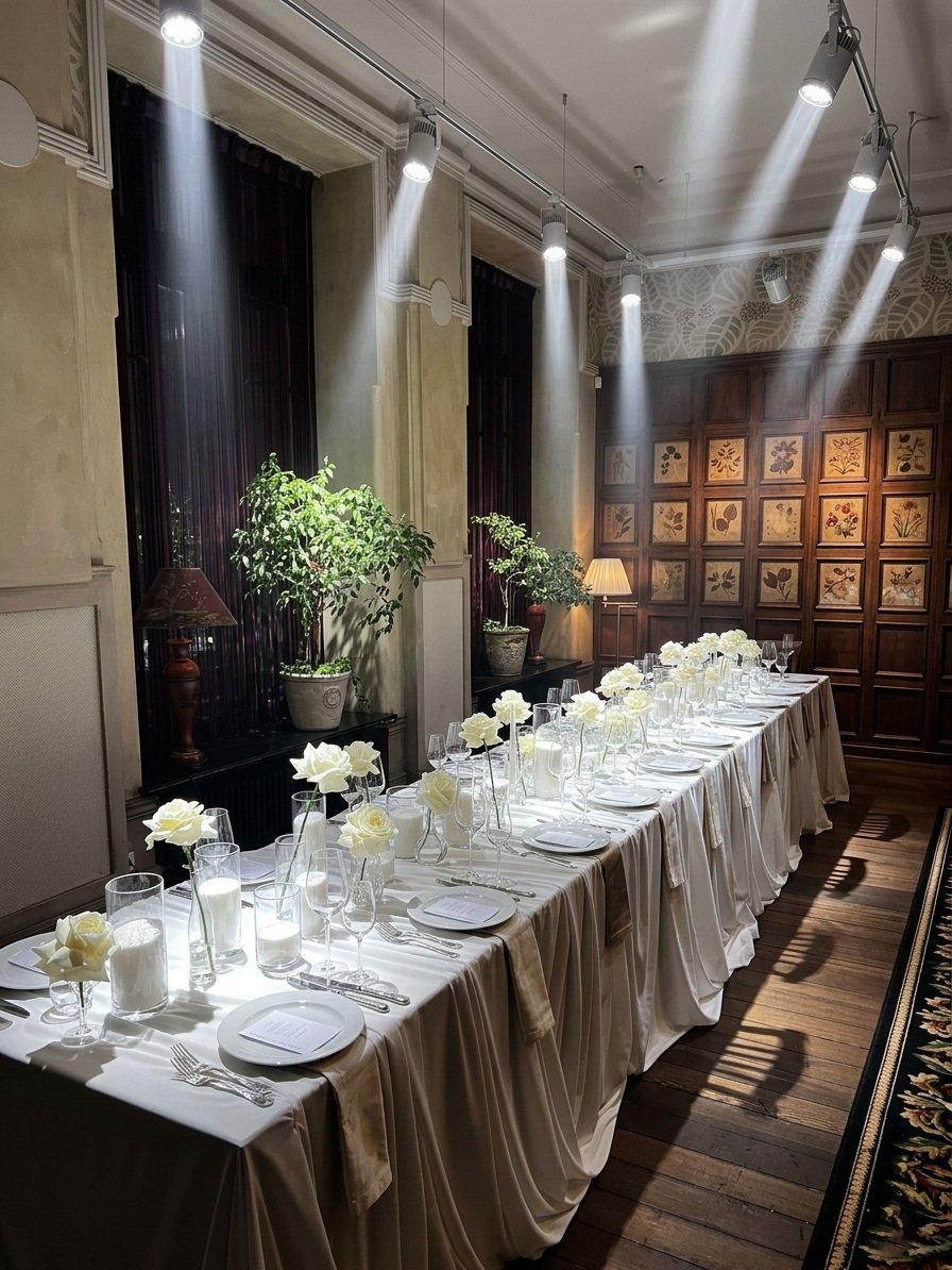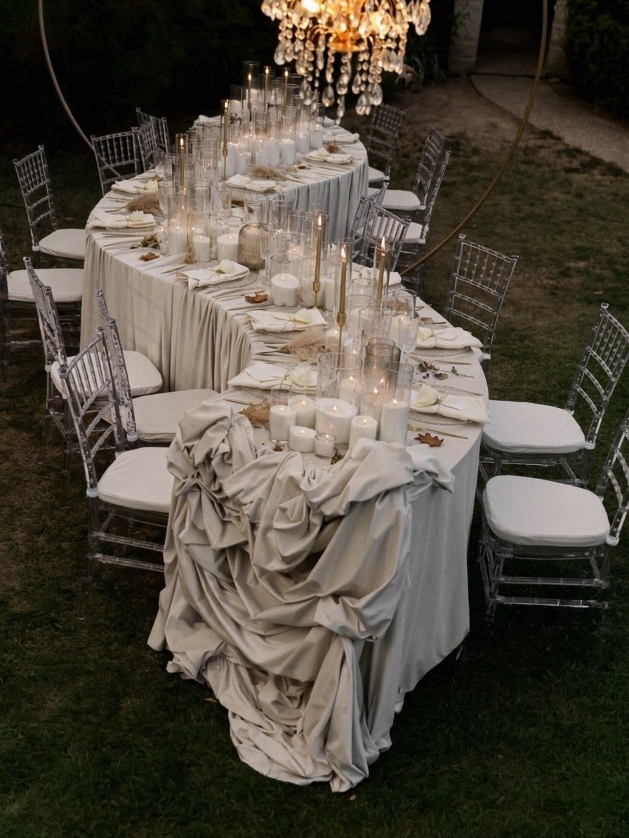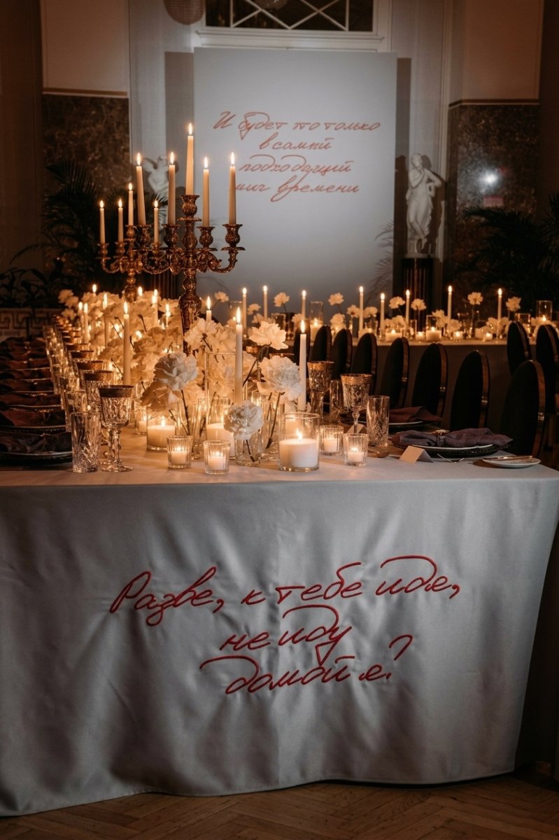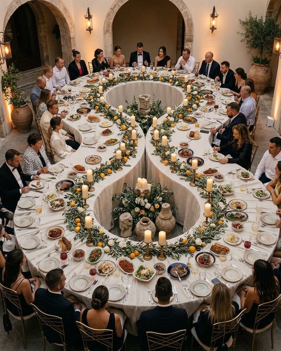 Плюсы: Идеально для лофтов, садов и камерных ужинов. Создает ощущение единства, будто все собрались за одним большим семейным столом. Позволяет использовать богатый декор: длинные цветочные раннеры, дорожки из ткани и множество свечей.