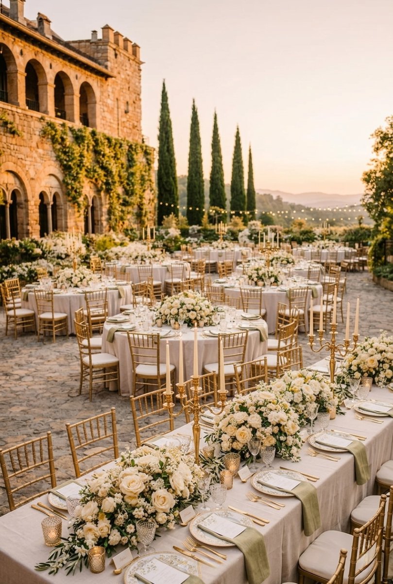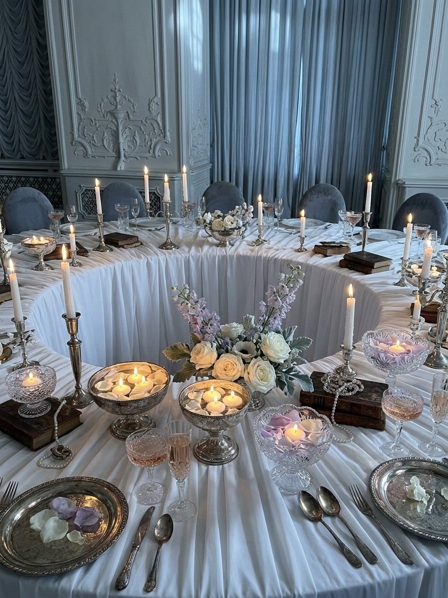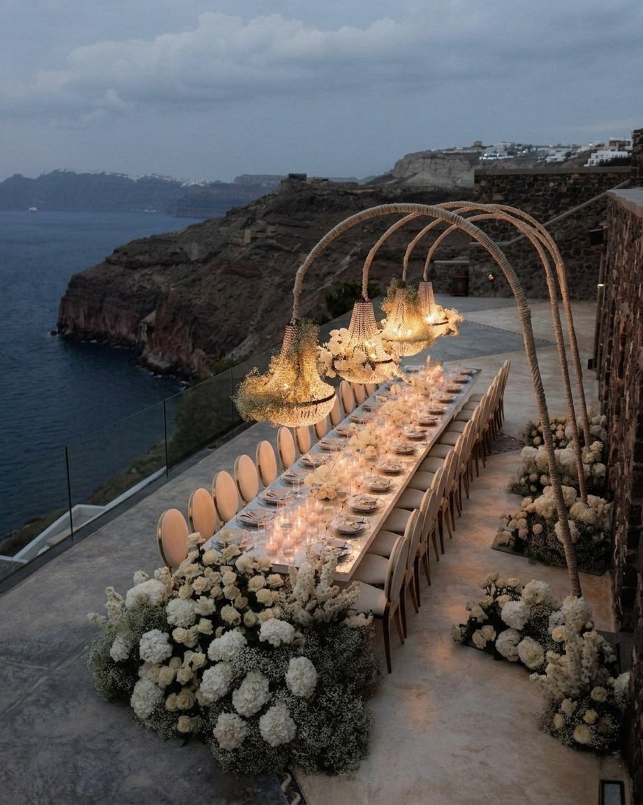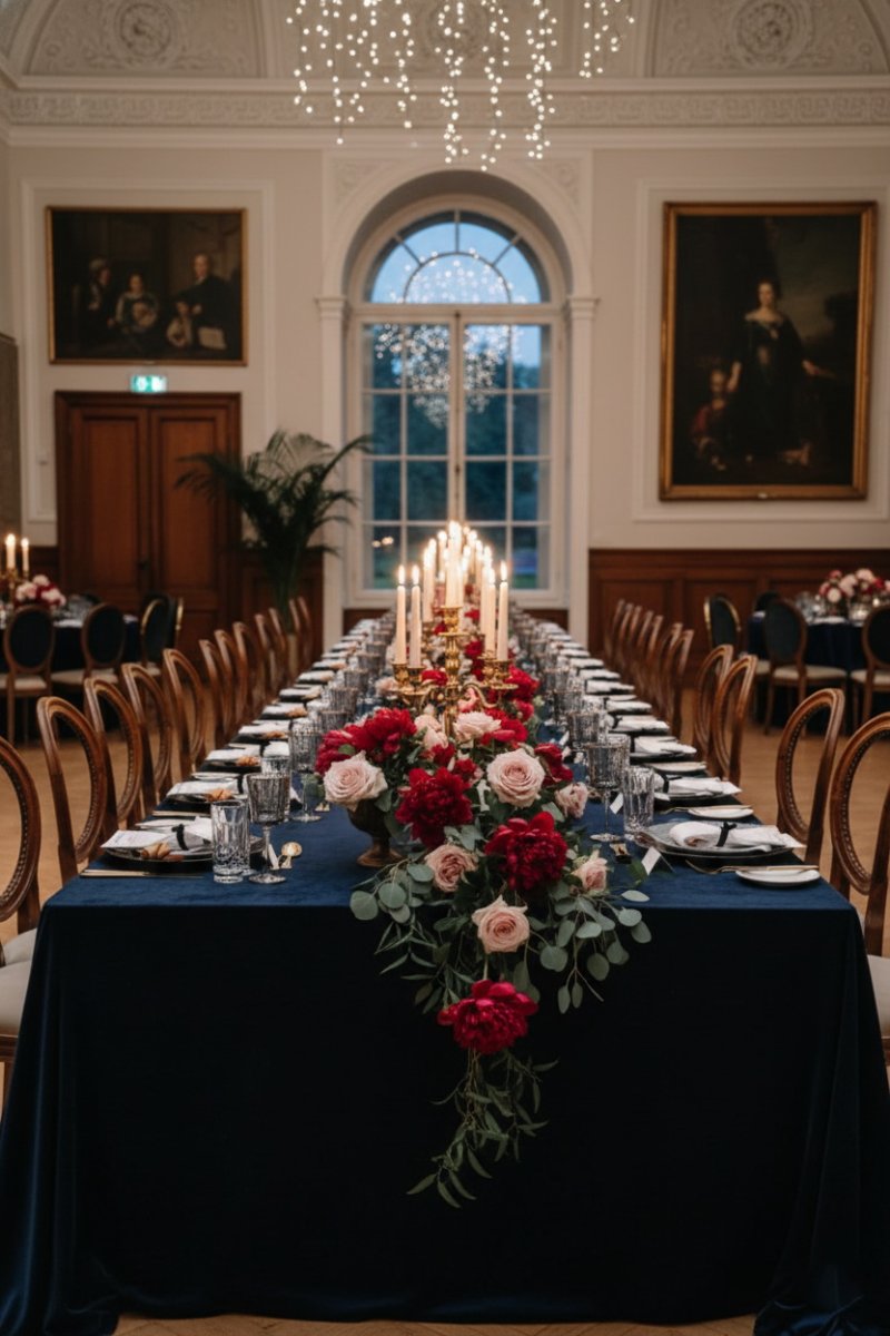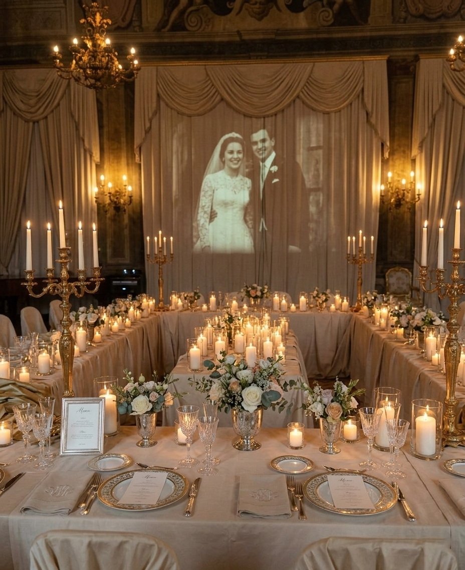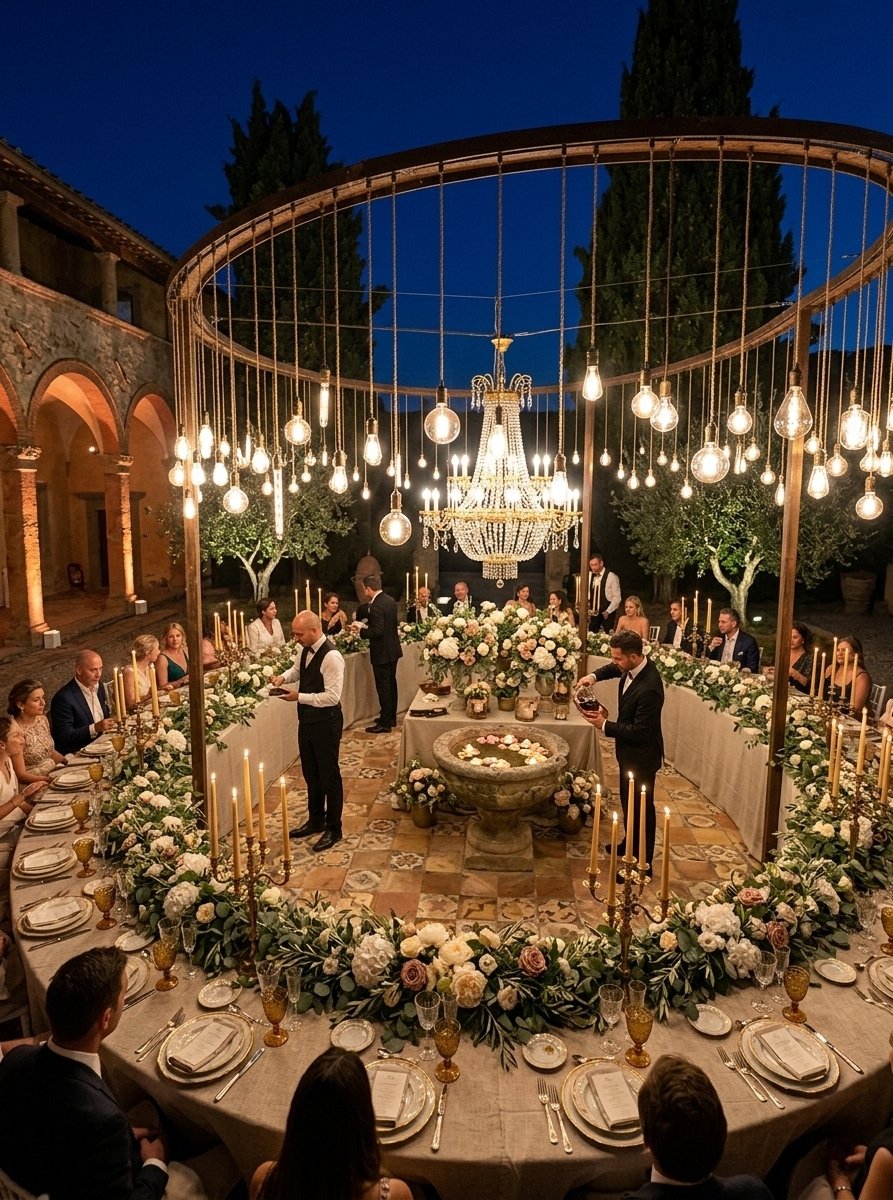 Плюсы: Идеально для лофтов, садов и камерных ужинов. Создает ощущение единства, будто все собрались за одним большим семейным столом. Позволяет использовать богатый декор: длинные цветочные раннеры, дорожки из ткани и множество свечей.