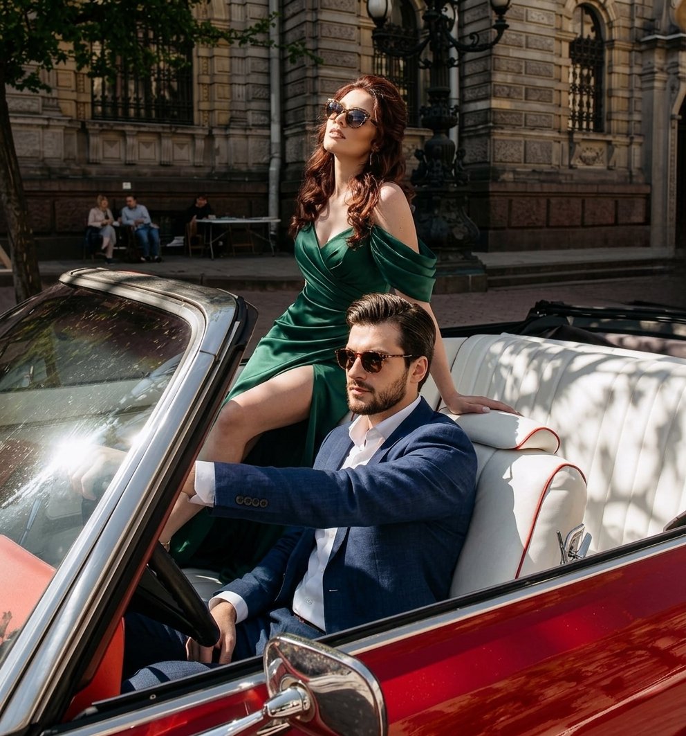 - Ретро-автомобили: ГАЗ-21 «Волга», старый Mustang или Porsche 356, или VW «Жук» в ретро стиле, идеально впишутся в винтажную или классическую свадьбу. Это история не про скорость, а про характер и эффектные кадры.